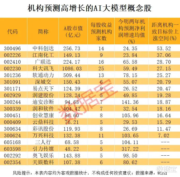 从未来增长潜力来看,根据5家以上机构一致预测,今明两年净利润增速均有望超20%的AI大模型概念股有18只。净利润预测增速均值靠前的是引力传媒、迪安诊断、创业慧康、三人行、万兴科技等。